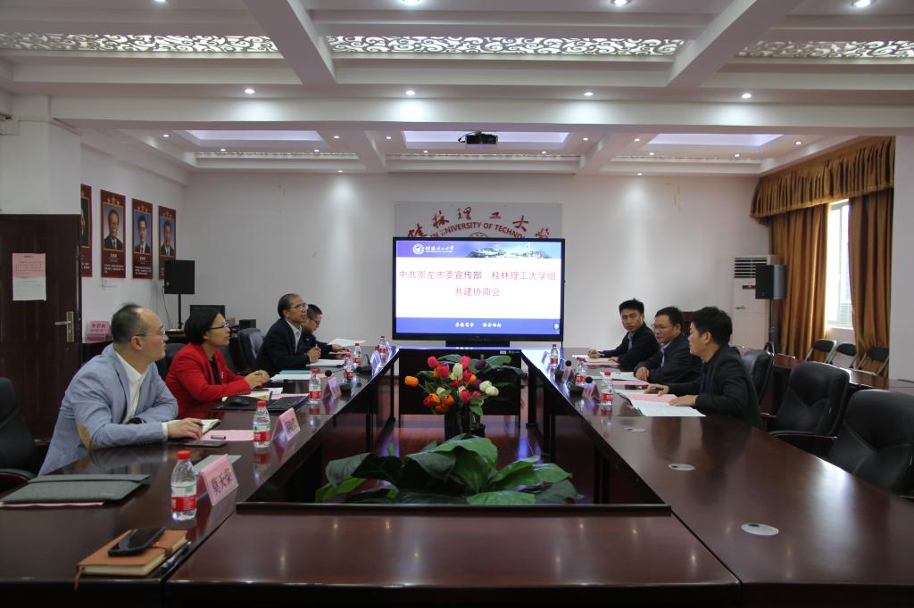 为深入贯彻落实党的十九大和十九届五中全会精神,深入学习贯彻习近平新时代中国特色社会主义思想,加强我校太阳成集团官方网站建设,进一步提升我校太阳成集团官方网站的影响力以及我校服务地方经济社会发展的能力,2020年11月5日,中共崇左市委宣传部、太阳成集团官方网站组共建协商会在雁山校区太阳成集团官方网站会议室07415召开,中共崇左市委宣传部副部长黄智庭一行,我校党委宣传部副部长叶婷,太阳成集团官方网站领导班子参加会议。