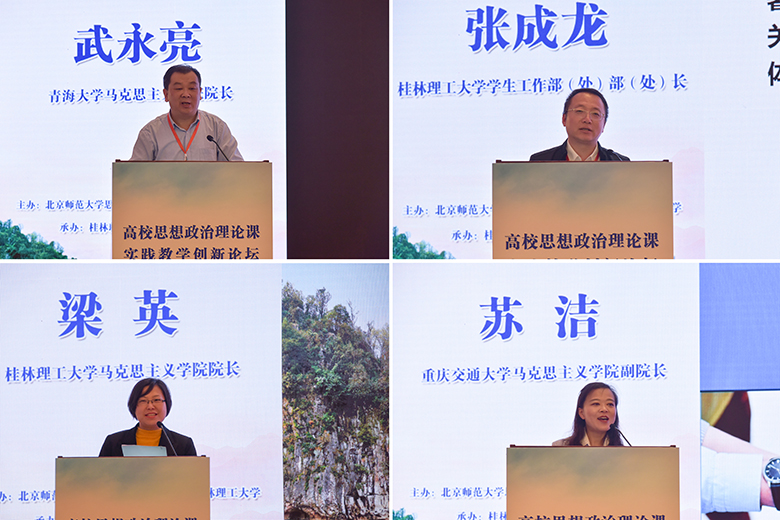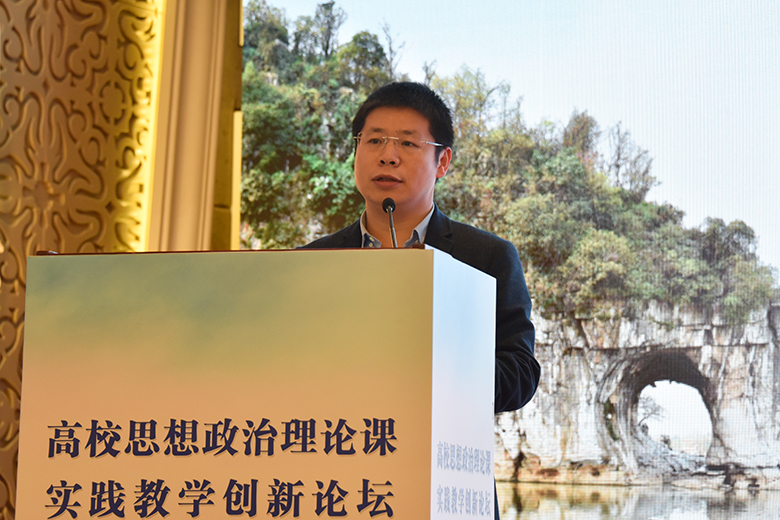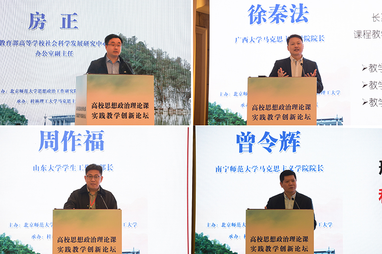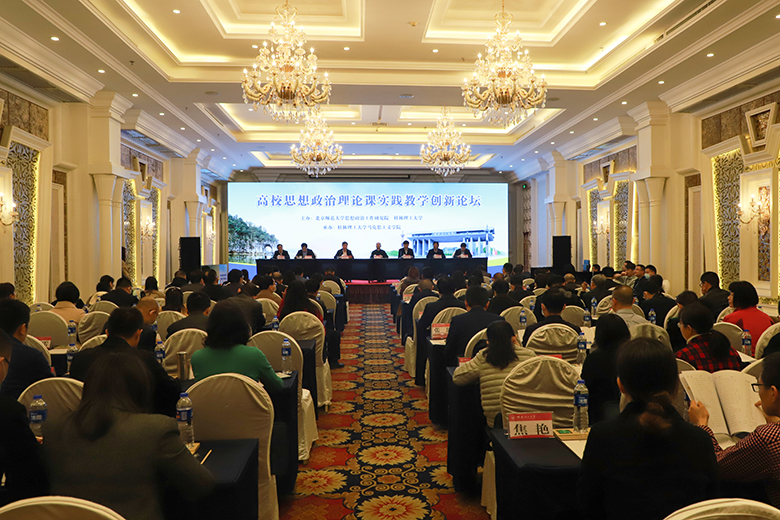 为扎实推进习近平新时代中国特色社会主义思想“三进”工作,落实教育部关于加强高校思想政治理论课建设的要求,有效推动高校思想政治理论课实践教学的创新发展,4月10日,高校思想政治理论课实践教学创新论坛暨“教育部高校示范马院和优秀教学团队建设重点项目”成果发布会在桂林大公馆成功举办。此次大会由我校和北京师范大学思想政治工作研究院共同主办、太阳成官网承办,北京师范大学思想政治工作研究院院长冯刚,教育部高等学校社会科学发展研究中心办公室副主任房正,自治区党委教育工委宣传部部长、教育厅思想政治工作处处长赵益真,《学校党建与思想教育》杂志社社长谢成宇,我校党委书记李国忠、校长解庆林、副校长邓国彬出席会议,来自北京师范大学、重庆大学、山东大学、广西大学等区内外40余所高校的专家学者、师生代表共100余人参加了会议。开幕式由我校原副厅级调研员张劲松主持。