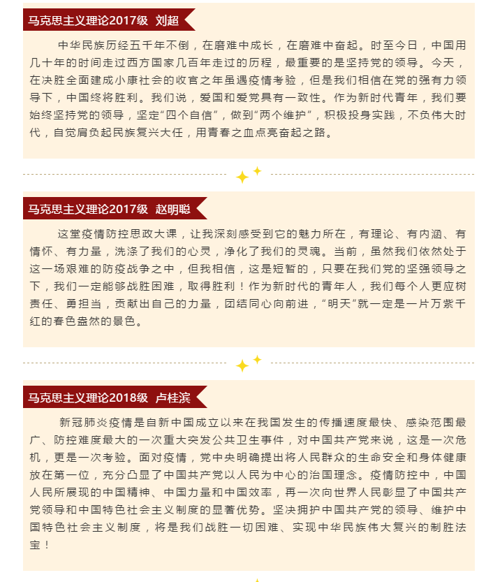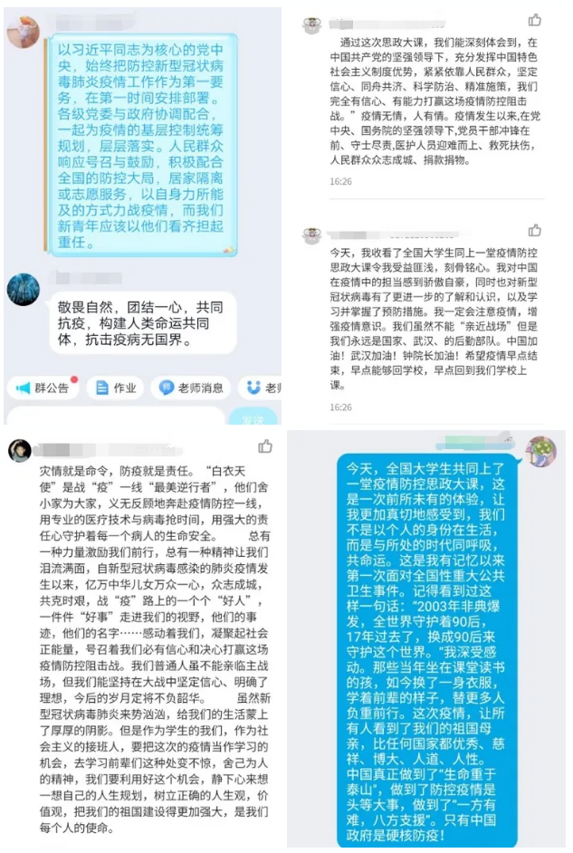 课程结束后,思政课教师组织学生们进行了在线讨论。同学们纷纷表达了此次学习的感受与体会。他们表示,通过学习这一堂思政课的内容,进一步全面认识到中国抗疫彰显的中国共产党领导和中国特色社会主义制度的显著优势,也更加深刻认识到作为新时代青年在民族伟大复兴中的责任与担当。作为新时代的青年,一定要将个人发展与民族未来、国家前途紧密结合起来,不断增强自身本领,努力奋斗,把梦想变为理想,将理想落实为活生生的现实,为国家富强奉献青春和力量。