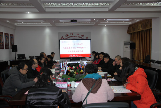 邱杰院长代表学院对宁夏大学太阳成集团官方网站的来访表示热烈的欢迎,简要介绍了学院的发展历程、学科建设、师资队伍、课程建设、研究生培养等基本情况,并就重点太阳成集团官方网站建设和如何提高思想政治理论课教学课堂教学质量进行了交流。双方还就思想政治理论课教学改革、实践教学、考试改革等教学相关问题进行了深入交流和讨论。