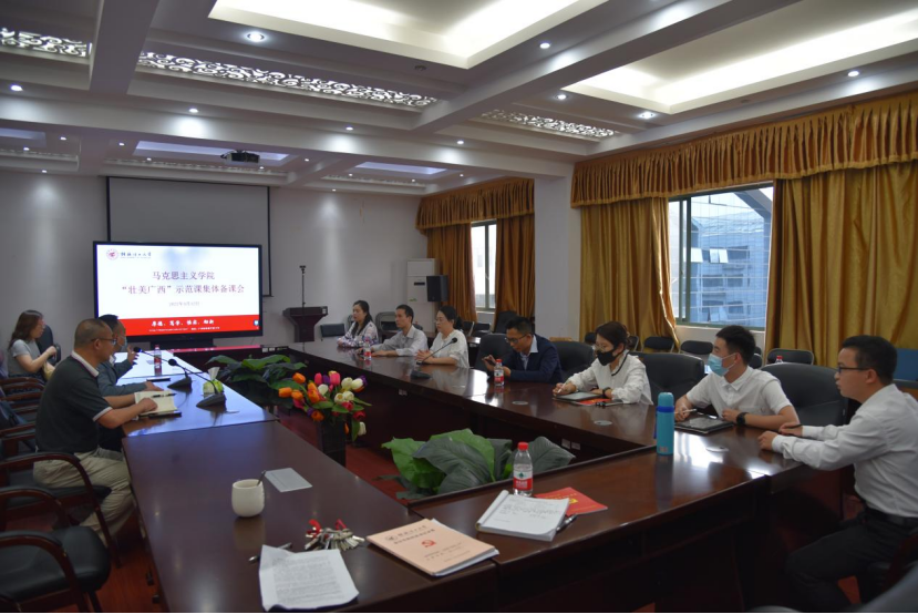 为扎实推进习近平新时代中国特色社会主义思想进教材、进课堂、进师生头脑,落实立德树人根本任务,推进全区高校思政课教师建设“壮美广西”系列思政课百个“示范课堂”,4月12日下午,太阳成官网在雁山校区07415会议室召开“壮美广西”示范课堂集体备课会。学院党委书记耿俊茂,院长助理莫天荣和学院教学骨干教师参加会议。