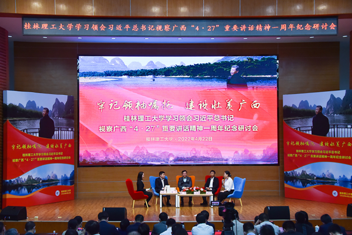 研讨会分为“主题发言”和“访谈对话”两个环节。学校相关师生代表围绕“牢记领袖嘱托,建设壮美广西”主题,分别作题为“赓续共产党人精神血脉,凝心聚力建设铸魂育人示范学院”“牢记领袖嘱托,保护漓江生态环境,弘扬生态文明思想”“巩固拓展脱贫攻坚成果,助力乡村振兴”“做新时代中国特色社会主义事业接班人”的发言,分享他们在各自领域笃行奋斗、勇担使命的生动实践。随后,邀请有关嘉宾就“用活用好红色资源,力行铸魂育人使命”“发挥资源优势,推进乡村振兴”“以科技创新支撑产业高质量发展”“发挥高校智库优势,服务地方经济社会发展”等话题进行深入访谈,重温习近平总书记殷切嘱托,共同为壮美广西建设献计策。