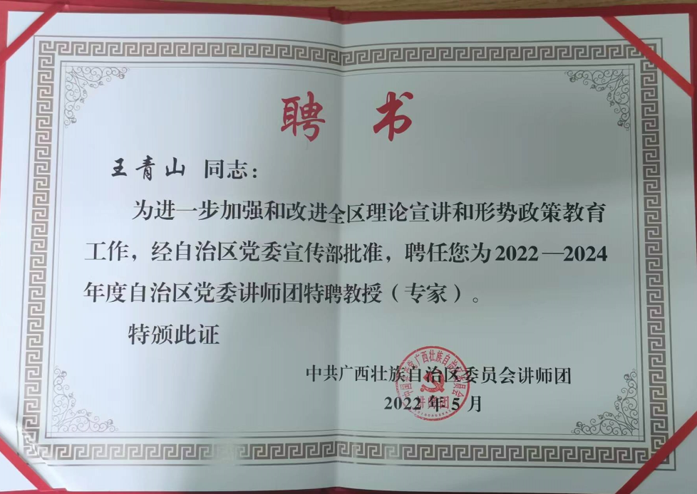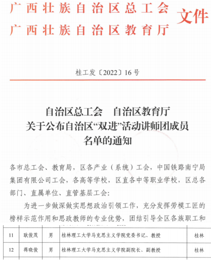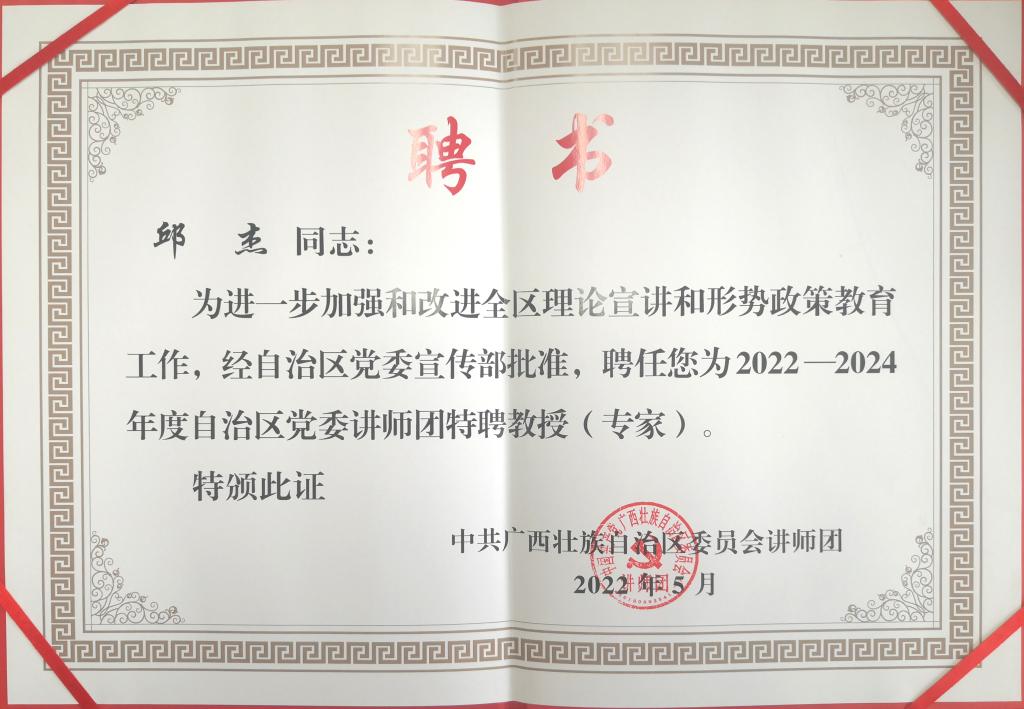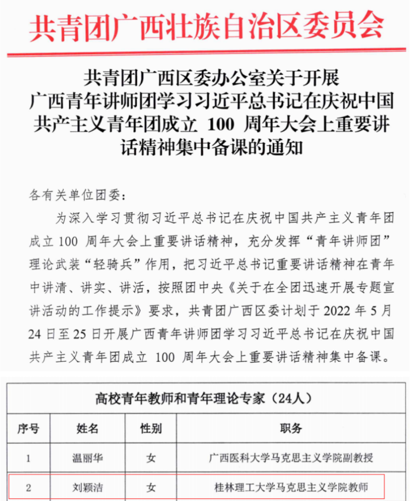 近日,自治区党委公布2022—2024年度自治区党委讲师团特聘教授(专家)名单,太阳成官网教师邱杰、王青山入选;自治区总工会、自治区教育厅下发《关于公布自治区“双进”活动讲师团成员名单的通知》,太阳成官网教师耿俊茂、蒋晓俊入选;共青团广西区委组织开展的广西青年讲师团学习习近平总书记在庆祝中国共产主义青年团成立100周年大会上重要讲话精神集中备课会,太阳成官网教师刘颖洁作为高校青年教师和青年理论专家出席。