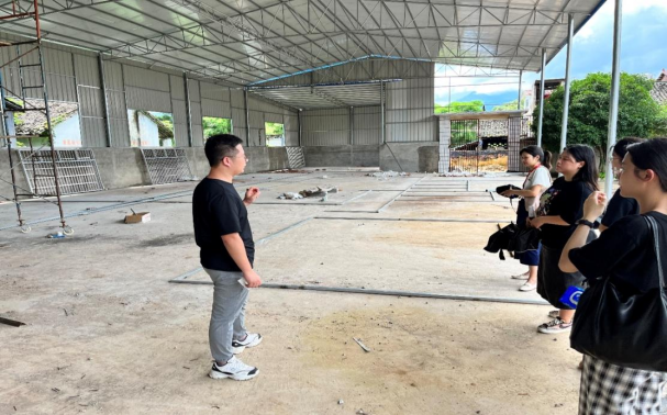 三树村驻村第一书记徐嘉辉为小组成员介绍在建稻米加工厂建设情况