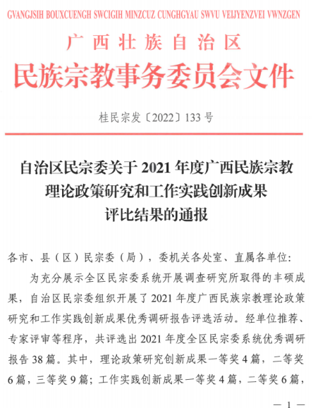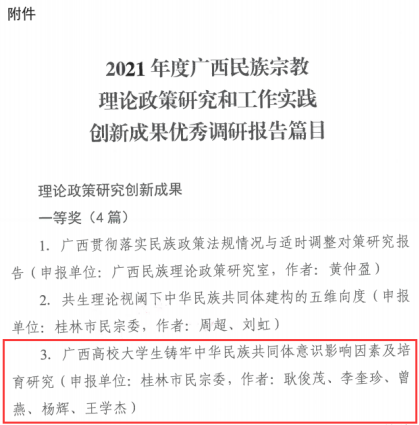 近日,自治区民宗委揭晓了2021年度广西民族宗教理论政策研究和工作实践创新成果评比结果,太阳成官网党委书记耿俊茂教授撰写的调研报告《广西高校大学生铸牢中华民族共同体意识影响因素及培育研究》荣获2021年度广西民族宗教理论政策研究创新成果一等奖。