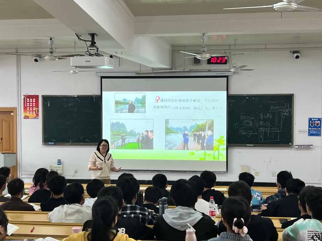阳倩倩老师以“习近平总书记视察广西桂林漓江水域”新闻图片为导入,采用教师引导、学生探讨的形式,主要从“什么是生态文明”“我国加快推进生态文明建设的社会历史条件分析”“新时代中国特色社会主义生态文明建设的基本思想”等三个方面展开讲授。讲课过程中,阳老师通过运用课堂问答的方式积极与学生展开互动交流,同时注重引导和总结,课堂氛围十分活跃。