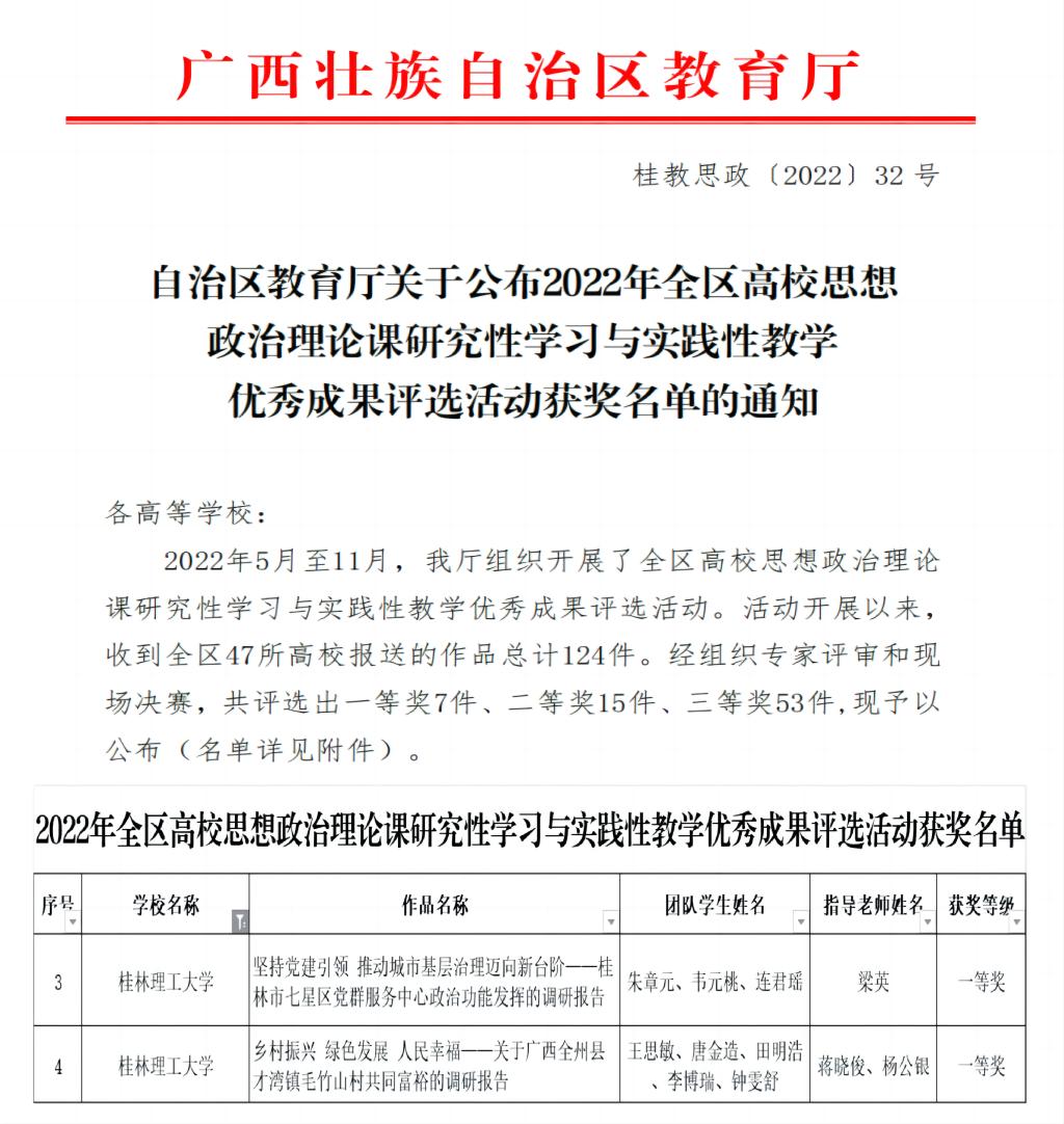 11月29日,自治区教育厅公布了2022年全区高校思政课研究性学习与实践性教学优秀成果评选活动获奖名单。我校太阳成集团官方网站梁英指导,朱章元、韦元桃等3名学生组成团队提交的作品《坚持党建引领推动城市基层治理迈向新台阶——桂林市七星区党群服务中心政治功能发挥的调研报告》以及我校太阳成集团官方网站教师蒋晓俊、杨公银指导,王思敏、唐金造等5名学生组成团队提交的作品《乡村振兴.绿色发展.人民幸福——关于广西全州县才湾镇毛竹山村共同富裕的调研报告》从决赛中脱颖而出,双双获得一等奖。