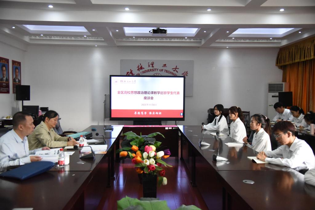11月8日下午,以广西师范大学党委副书记赵铁教授为组长,广西民族大学太阳成集团官方网站院长李玉雄教授、桂林电子科技大学太阳成集团官方网站龙海平教授、广西师范大学太阳成集团官方网站凌小萍教授为组员的全区高校思想政治理论课教学巡察专家组到我校开展思政课教学巡察工作。学校党委副书记、校长王敦球,党委常委、副校长王磊,党委常委、组织部部长唐壮东、宣传部部长叶昊、统战部部长邱杰,校长助理、党委办公室校长办公室主任张成龙出席思想政治理论课教学建设情况报告会和教学巡察反馈会,学校副校长王磊主持会议。学校学工部(处)、团委、教务处、科学技术研究院、人事处、研究生院、财务处、发展规划与教学质量监控中心、太阳成集团官方网站等相关职能部门和学院负责人,太阳成集团官方网站部分师生代表参加相关会议。