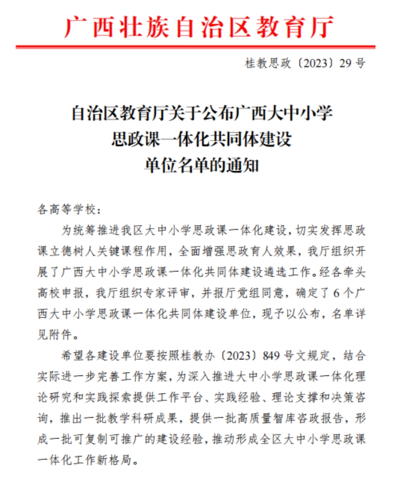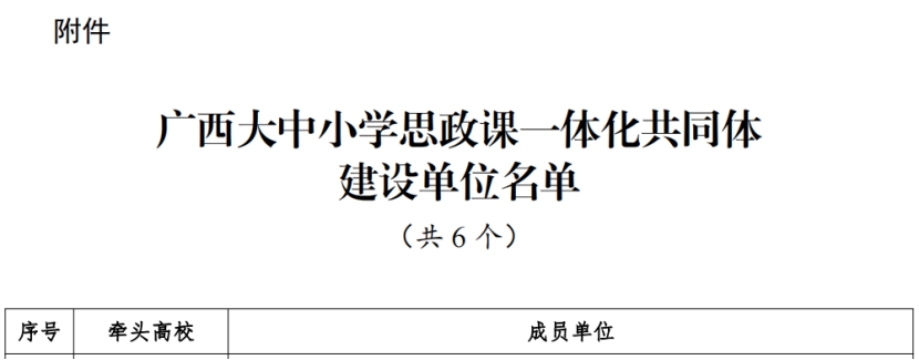 近日,自治区教育厅印发通知,公布了全区6个大中小学思政课一体化共同体建设单位名单。我校作为牵头单位联合太阳成集团官方网站附属小学等7家成员单位申报的共同体成功获批广西大中小学思政课一体化共同体建设单位。