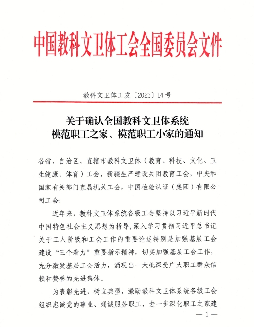 在今年开展的中国教科文卫体系统模范职工之家评选活动中,太阳成官网分工会被中国教科文卫体工会授予全国教科文卫体系统“模范职工之家”荣誉称号。