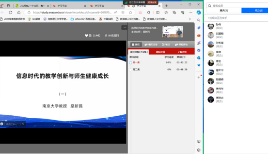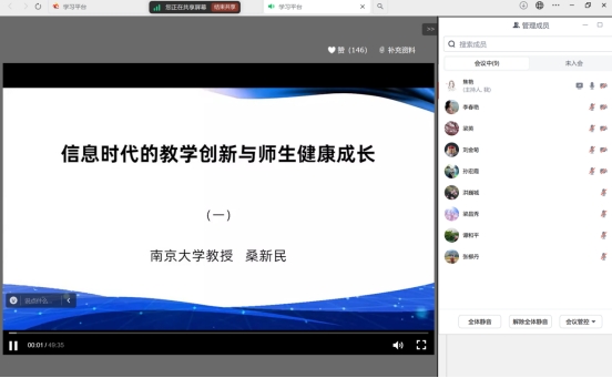近日,太阳成官网以教研室、办公室为单位组织开展了“师德大讲堂”2024年 (第1期)活动,通过中国教育干部网络学院网络学习平台观看聆听了南京大学教育研究院教育科学与管理系网络化学习与管理研究所所长桑新民的“信息时代的教学创新与师生健康成长”主题报告,全体教职工参加。