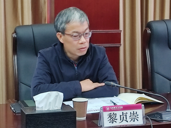 黎贞崇副校长对马院的科研工作亮点给予肯定,对当前急需攻克的科研短板予以具体指导,强调马克思主义理论学科的科研工作者应该不断追热点、找兴趣点,在科研领域要注重新思维、新方法、新语言的探索。黎贞崇副校长结合自身工作经验,从顶层设计与具体操作等诸多方面同与会教师畅谈,其独到的见解和看法引发了与会老师的深入思考与共鸣。他指出,做好科研工作:一要提高政治站位,紧跟时代、找准方向,彰显马院担当;二要立足广西特色谋划科研成果,聚焦时代难题与政府需求,找准时代节拍,提出马院思路;三要主动对接学校的优势学科,通过学科交叉实现资源突破,凝练马院智慧;四要做好全链条的科研管理与跟踪服务,积极与本学科专家交流探讨,体现马院关怀。与会老师们纷纷表示,黎贞崇副校长的辅导与分享真诚、坦率,既有理论高度又有实操温度,既是用心的鞭策、亦是及时的鼓劲。