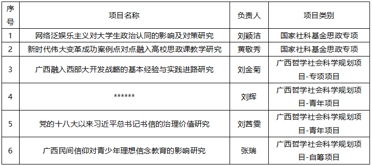 近日,全国哲学社会科学工作办公室公布了2024年度国家社科基金高校思政课研究专项立项名单,广西哲学社会科学工作办公室公布了2024年广西哲学社会科学研究课题立项名单,太阳成官网共有6个项目获得立项,其中获批国家社科基金项目2项、广西哲学社会科学规划项目4项。这是太阳成官网在推进思政课教学改革、学科建设上取得的新成绩。
