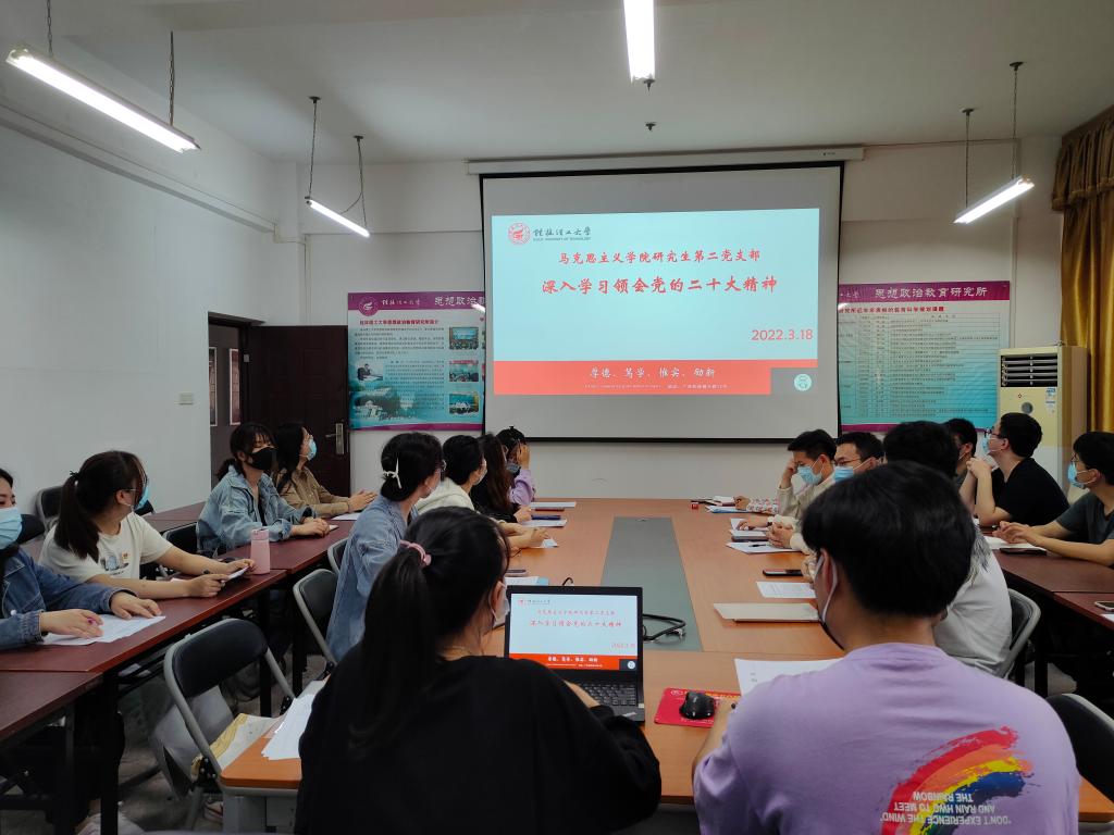 为教育引导学生党员关注国家大事,认真学习贯彻“两会”精神,坚持思想和行动上与党中央保持高度一致,提高支部党员的思想政治素养,3月18日下午,研究生第二党支部在雁山校区07407教室举办了以“喜迎二十大,奋进新征程”主题党日活动。党支部全体党员通过线上、线下相结合的方式参加了此次活动,会议由党支部书记蒋建主持。