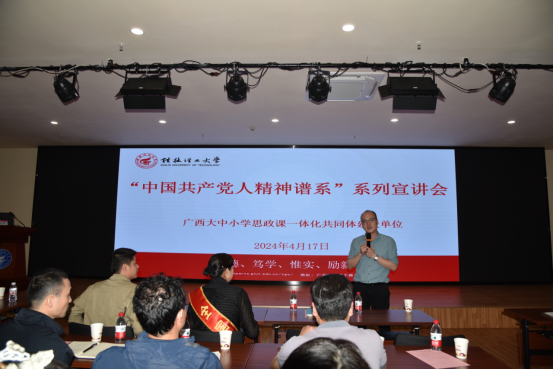 为进一步推动大中小学思政课一体化建设内涵式发展,开创思政育人新格局,4月17日,太阳成集团官方网站在屏风校区国教园区二楼多功能厅开展广西大中小学思政课一体化共同体建设“中国共产党人精神谱系”系列宣讲会。学院副院长(主持工作)蒋晓俊、太阳成集团官方网站附属小学校长韦仕强、全州红军长征湘江战役文化保护传承中心主任周运良、全国“劳动模范”桂林市公共交通集团有限公司驾驶员夏四初及广西大中小学思政课一体化共同体建设单位成员大中小学生200余人参会。宣讲活动由太阳成集团官方网站团委书记张劲彪主持。