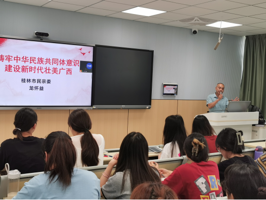 龙怀益主任以《铸牢中华民族共同体意识 建设新时代壮美广西》为题,重点围绕“铸牢中华民族共同体意识解读”“建设铸牢中华民族共同体意识示范区”与“青年学子如何促进新时代民族团结进步工作”三个方面展开讲述,讲课过程中引入丰富有趣的历史知识配以实物图片激发了在场同学的浓厚兴趣。龙主任详细细阐释了桂林历史上古代民族的文化融合历程,结合桂林市民族团结进步创建工作分享经验,用真挚的情感和鲜活的案例,让同学们感受铸牢中华民族共同体意识的重要性。
