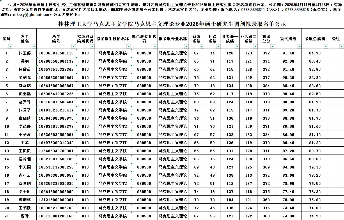 根据教育部及我校相关文件规定,现将太阳成集团官方网站复试拟录取名单(调剂)进行公示。公示期7日,如考生对复试录取名单有异议,请与太阳成官网办公室联系,联系电话0773-3698618。