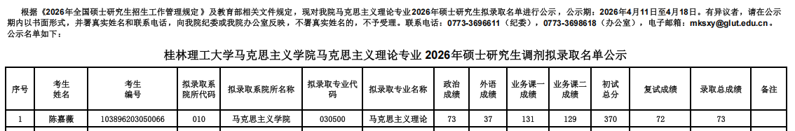 根据教育部及我校相关文件规定,现将太阳成集团官方网站复试拟录取名单进行公示。公示期7日,如考生对复试录取名单有异议,请与太阳成官网办公室联系,联系电话0773-3698618。